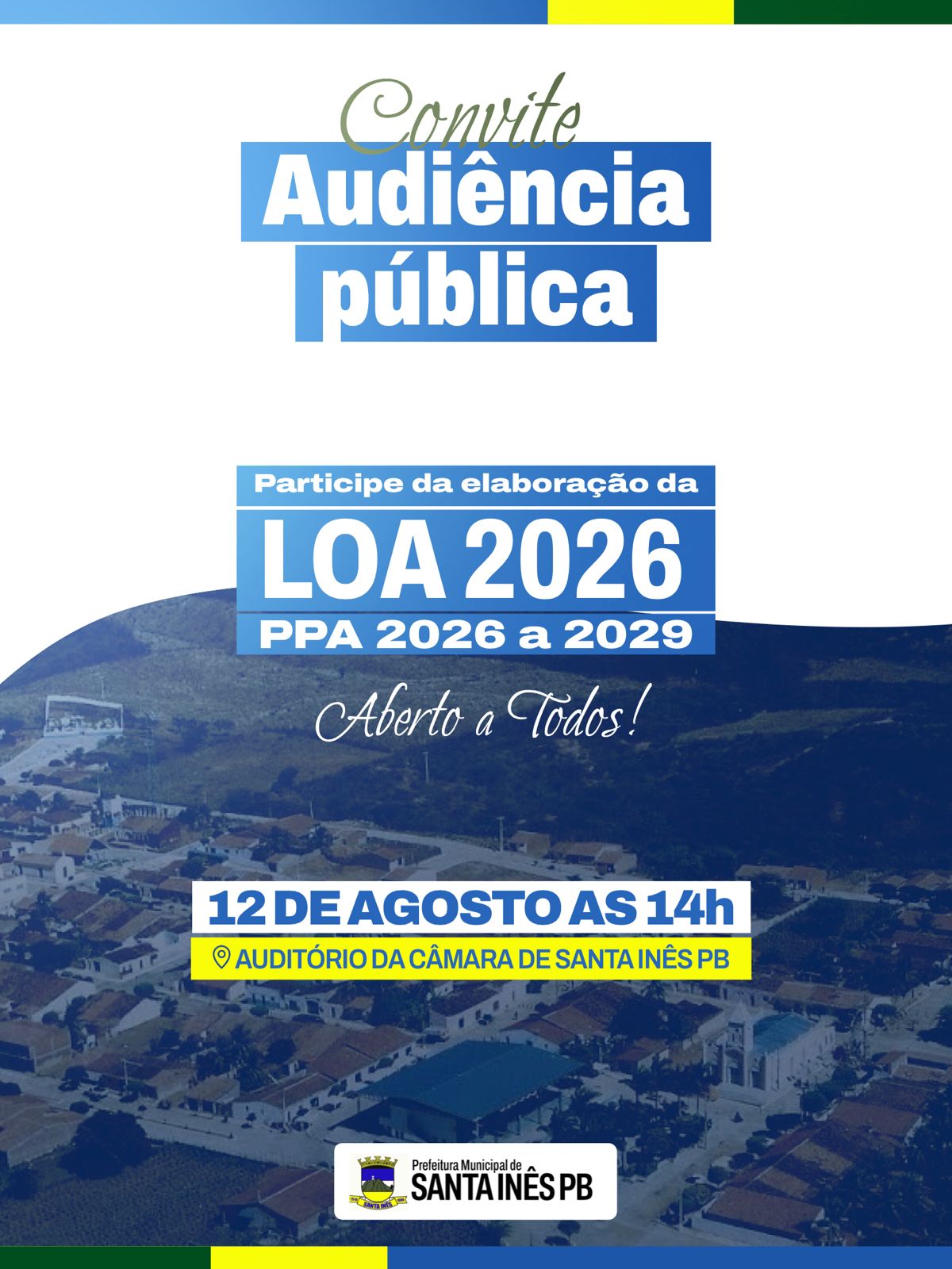 A Prefeitura Municipal de Santa Inês convida toda a população para participar da Audiência Pública de Elaboração da Lei Orçamentária Anual (LOA) 2026 e do Plano Plurianual (PPA) 2026–2029.